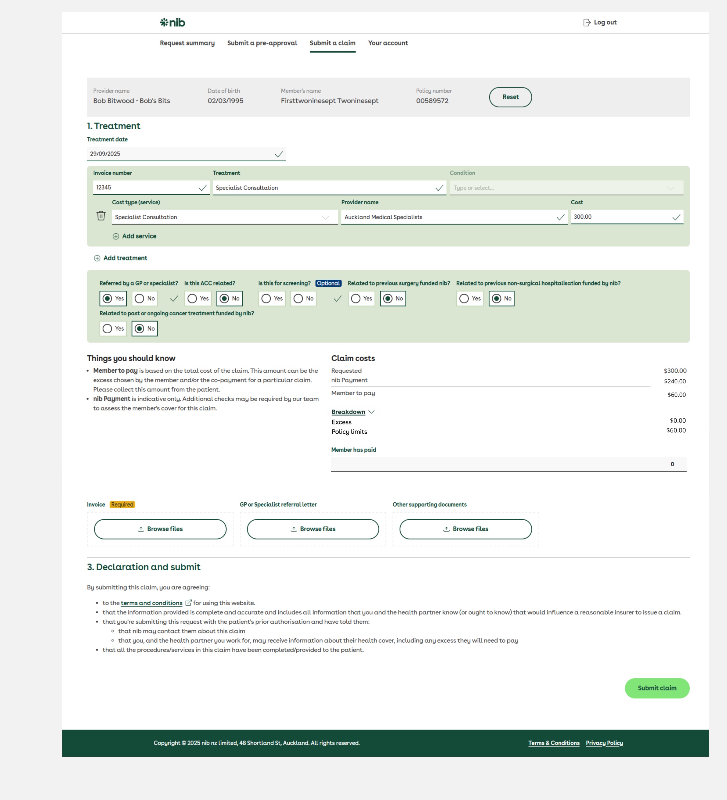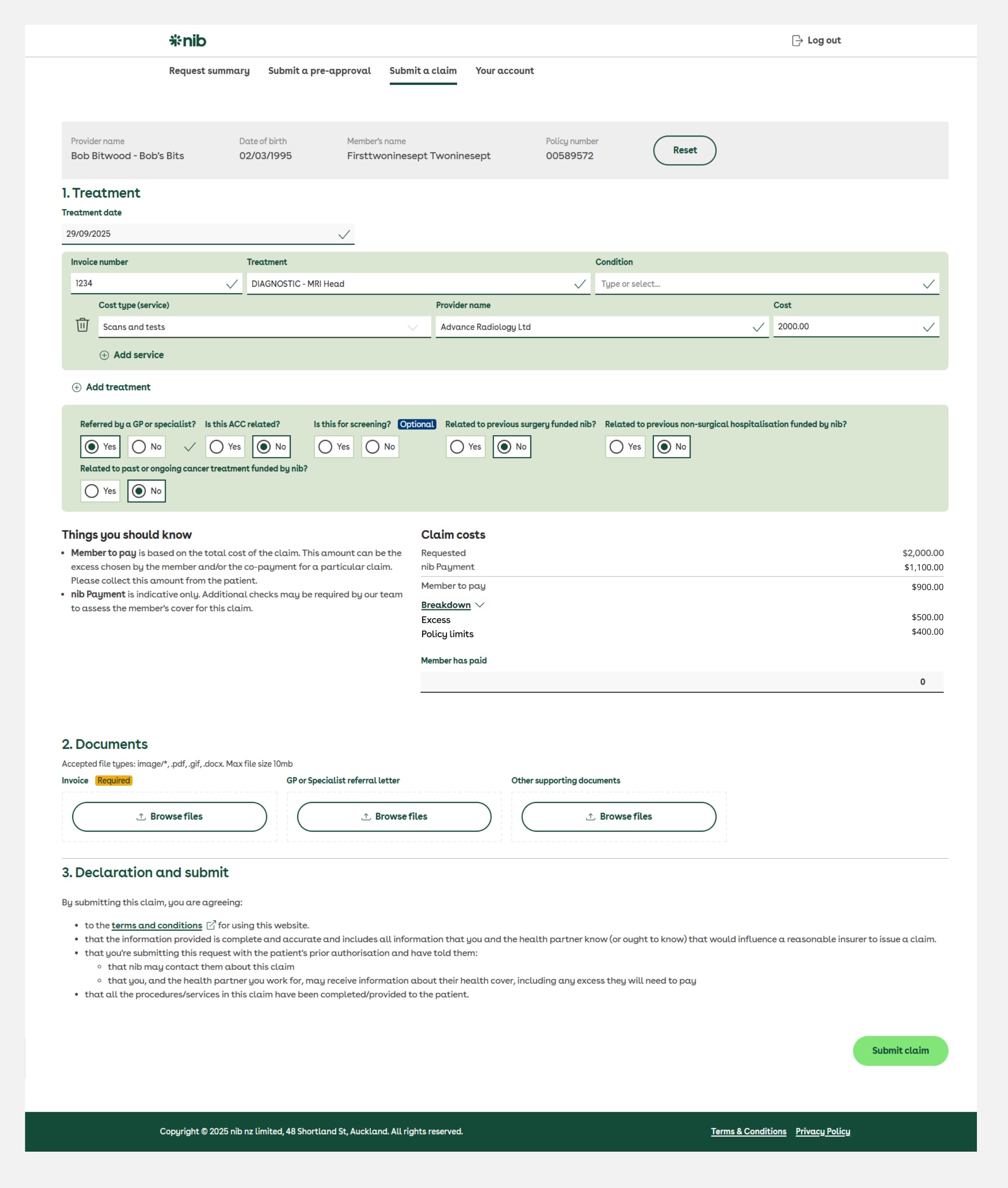 Here is an example of how the co-payment will be applied on the nib provider portal. It will show you how much the member is required to pay.